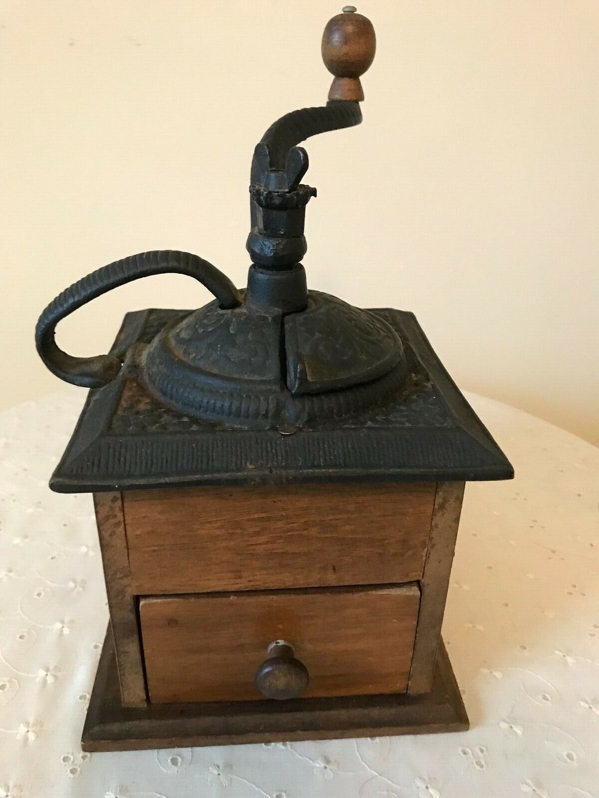 Title (ebay affiliate link): Antique Wood Coffee Grinder with Iron Hand Crank and Iron Top