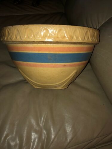 Antique Mccoy Lg Pink Blue Yellow Ware Mixing Bowl Primitive Stoneware Bowl