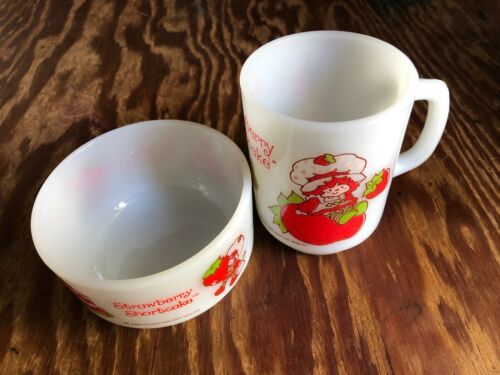 Strawberry Shortcake ~ 1980 AG Stacking Milk Glass Mug & Bowl Anchor Hocking
