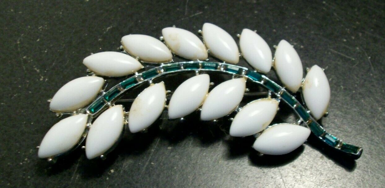 Vintage feather leaf pin brooch milkglass petals emerald green inset stones stem