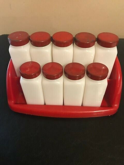 Title (ebay affiliate link): Vintage [50''s] Milk Glass Spice Rack [9 Jars] In Red Plastic Holder [Mountable]