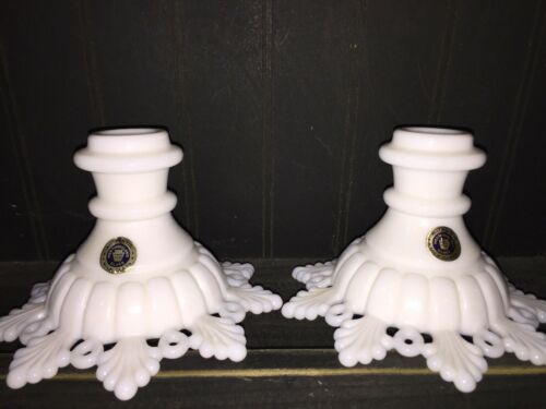 Pair Vintage Westmoreland Milk Glass Ring and Petal Candlesticks Candle Holders