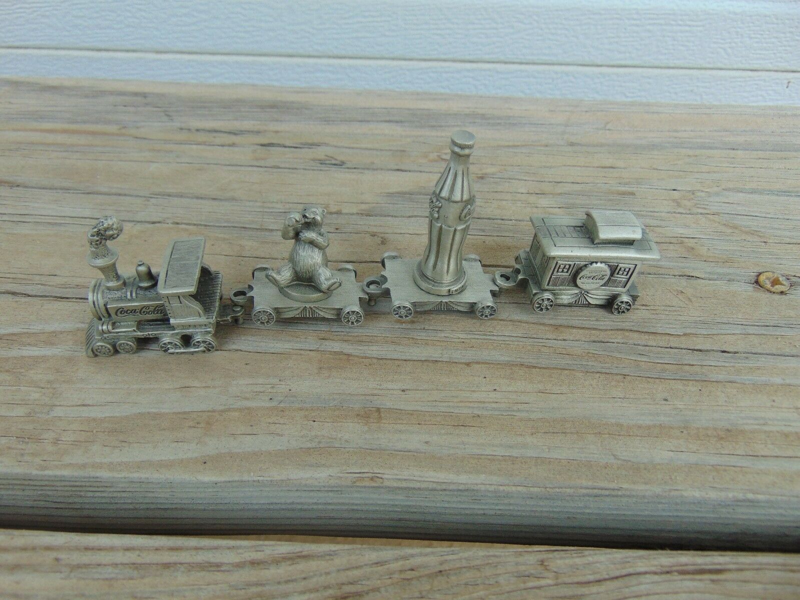 Title (ebay affiliate link): Vintage Coca Cola Pewter Train Set of 4 Coke Bottle Engine Bear Caboose
