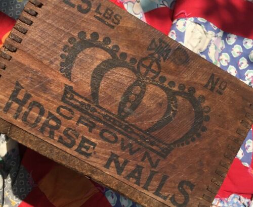Title (ebay affiliate link): Antique Wood Box CROWN HORSE NAILS Old Genuine Farm Blacksmith ELMIRA NY
