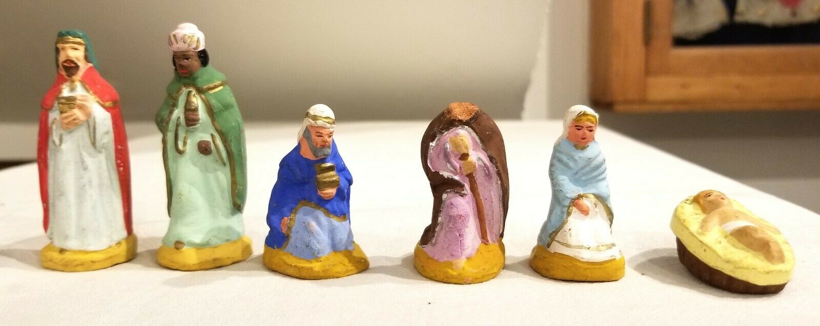 Title (ebay affiliate link): Jesus, Mary, Joseph (damaged), Three KIngs. Early 1930s Santons. France. Nice.
