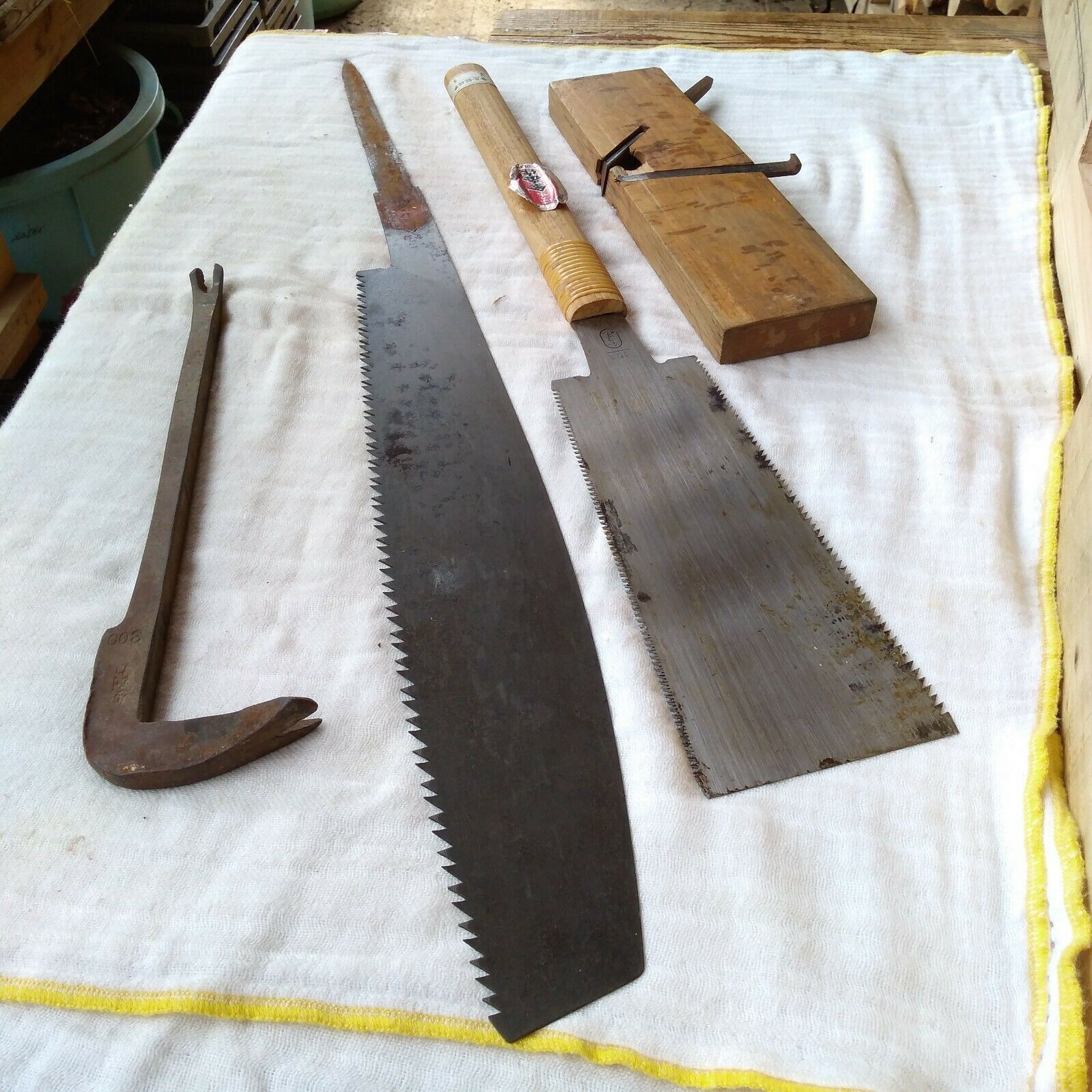 Title (ebay affiliate link): Vintage Japanese Carpentry Tools - Ripsaw,Ryoba Saw,Groove Plane,Kajiya Nailpull