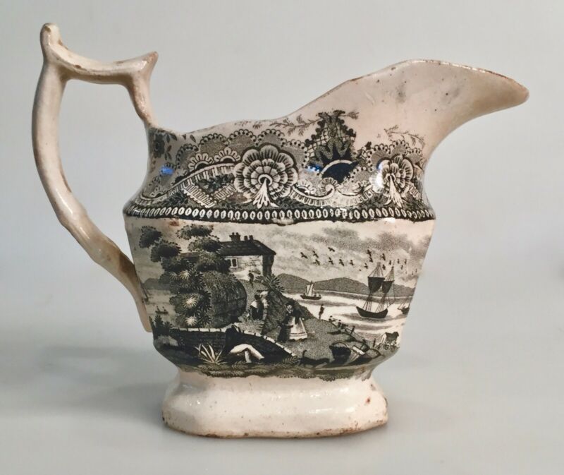 Antique Early American Staffordshire Ironstone Creamer Black Transfer Seascape
