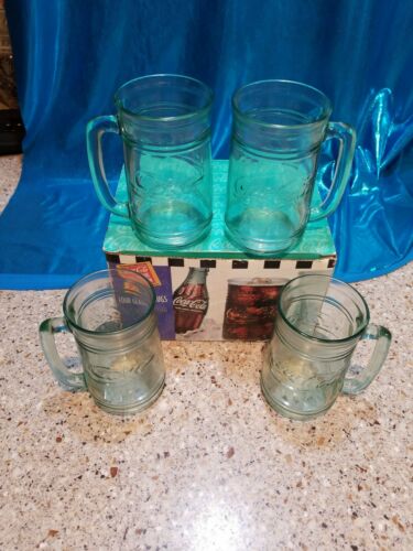 Title (ebay affiliate link): Vintage Set of 4 Green Tinted Coca Cola Coke Glass Mugs Handles In Original Box