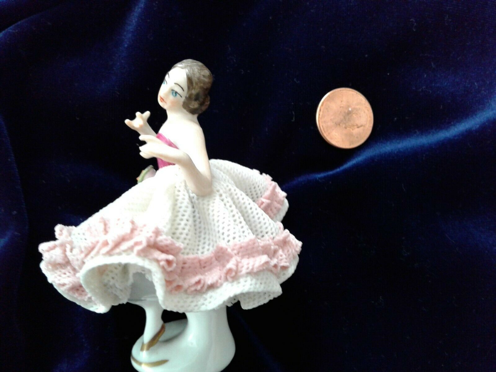 Title (ebay affiliate link): German, Dresden Porcelain Mini Ballerina pink/white mesh skirt Hall Marked