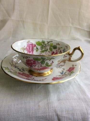 ROYAL CHELSEA tea cup and saucer PINK teacup with flowers roses gold gilt trim