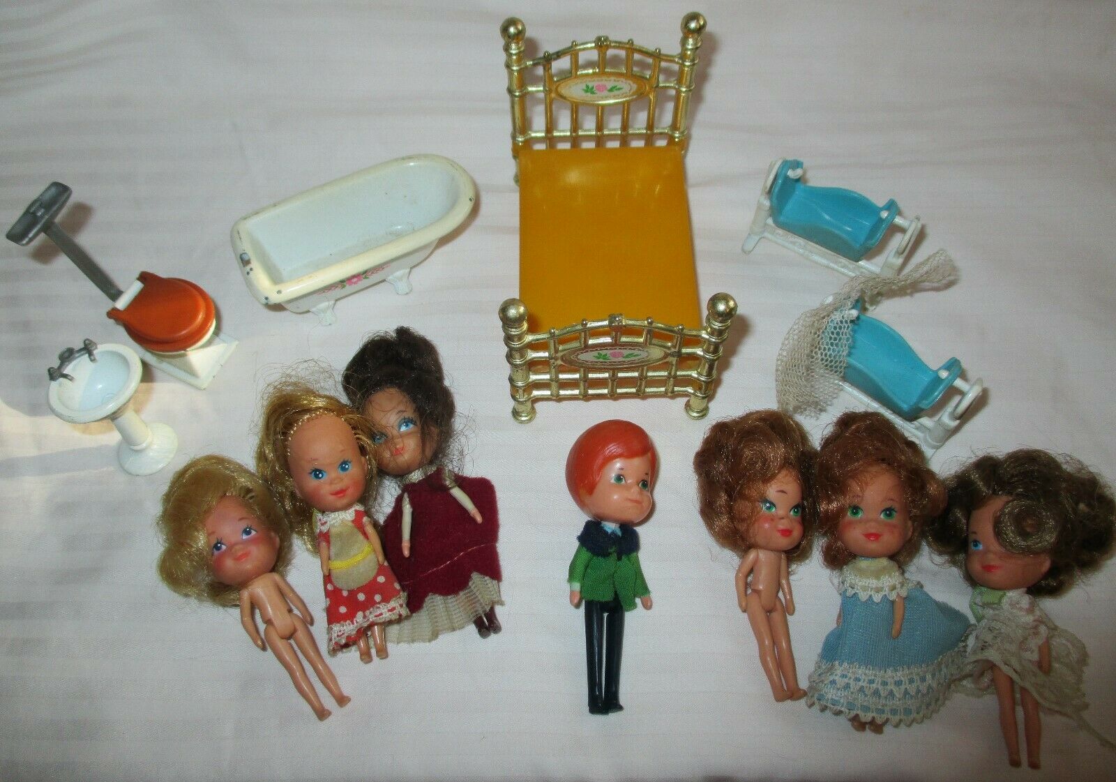 Title (ebay affiliate link): Lot 7 Vintage Mattel Kiddle Dolls & Assorted LITTLES Metal Dollhouse Furniture