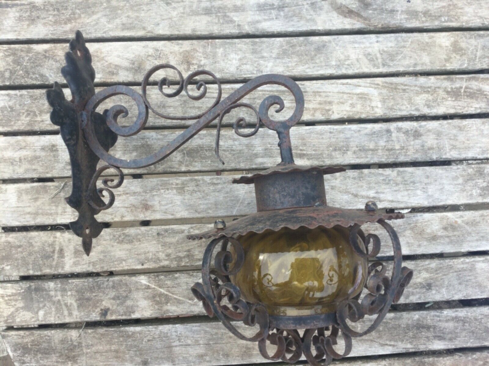 Title (ebay affiliate link): ARTS & CRAFTS WROUGHT IRON OUTSIDE PORCH WALL LAMP WITH AMBER GLASS SHADE 13"