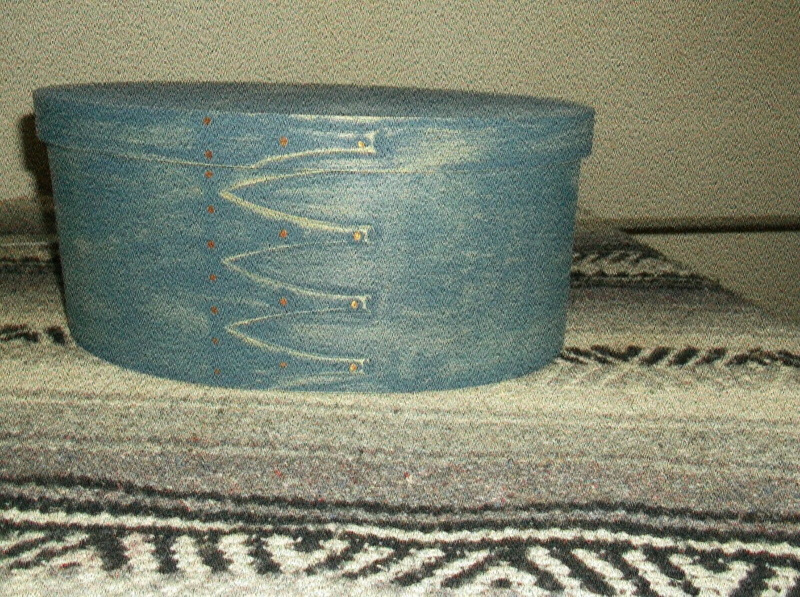 Title (ebay affiliate link): EARLY PRIMITIVE WOOD SHAKER PANTRY BOX DRY BLUE PAINT OVAL SHAPED 4 FINGER BENT