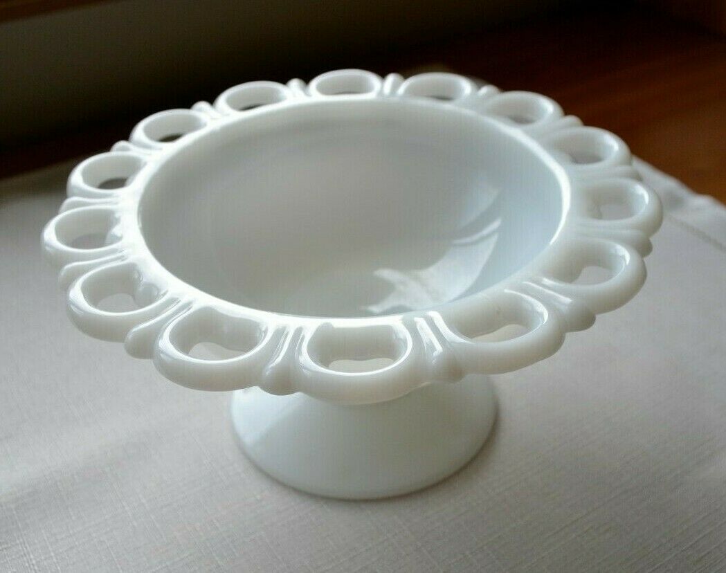 Title (ebay affiliate link): VTG Lace Edge Milk Glass White Footed Compote Candy Dish Bowl 3.5" tall 7" wide