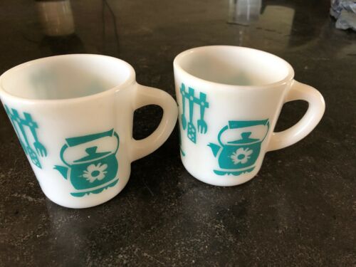 2 Vintage Hazel Atlas White Milk Glass Mug Turquoise Kitchen Tea Pot Mid Century