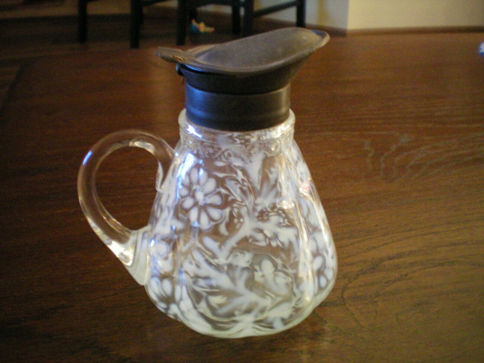 Vintage Clear Glass w/ White Flowers Lidded Syrup Pitcher