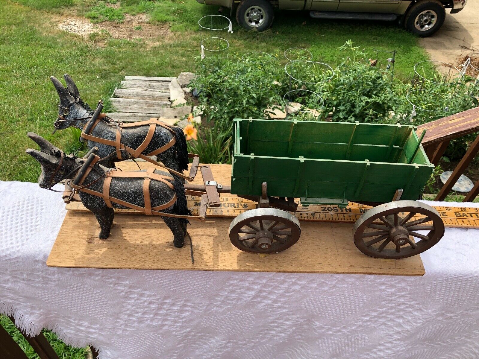 Title (ebay affiliate link): VINTAGE WOODEN PAINTED FOLK ART HANDMADE HORSE DONKEYS WAGON STAGECOACH ORIGINAL