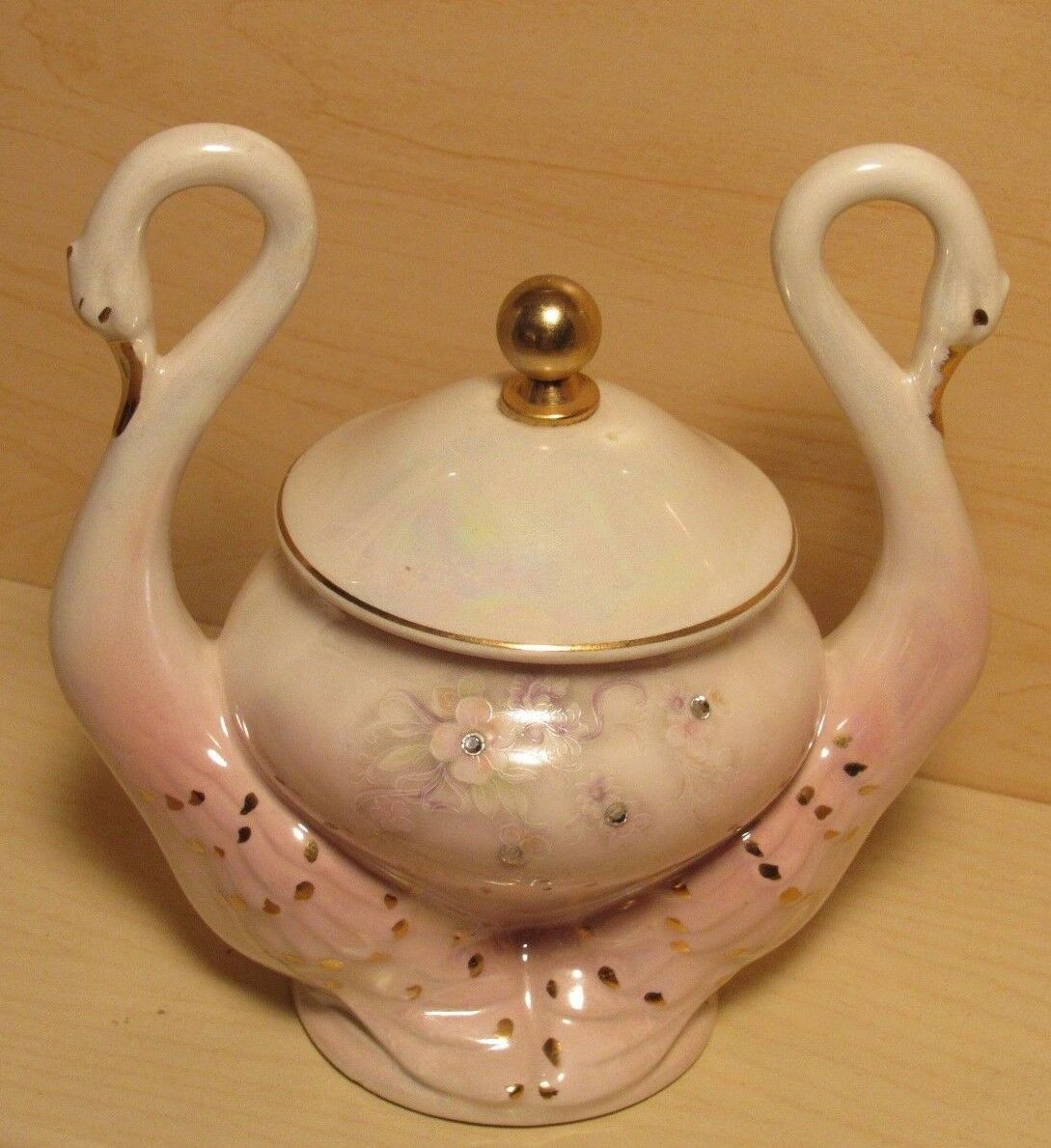 Title (ebay affiliate link): Opalescent Capodimonte Swans & Floral Gold & Rhinestones Lidded Sugar Bowl Italy