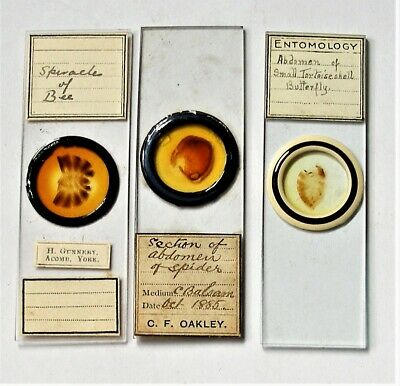 3 x Antique Entomology MICROSCOPE SLIDES, SPIDER, BEE & BUTTERFLY Sections
