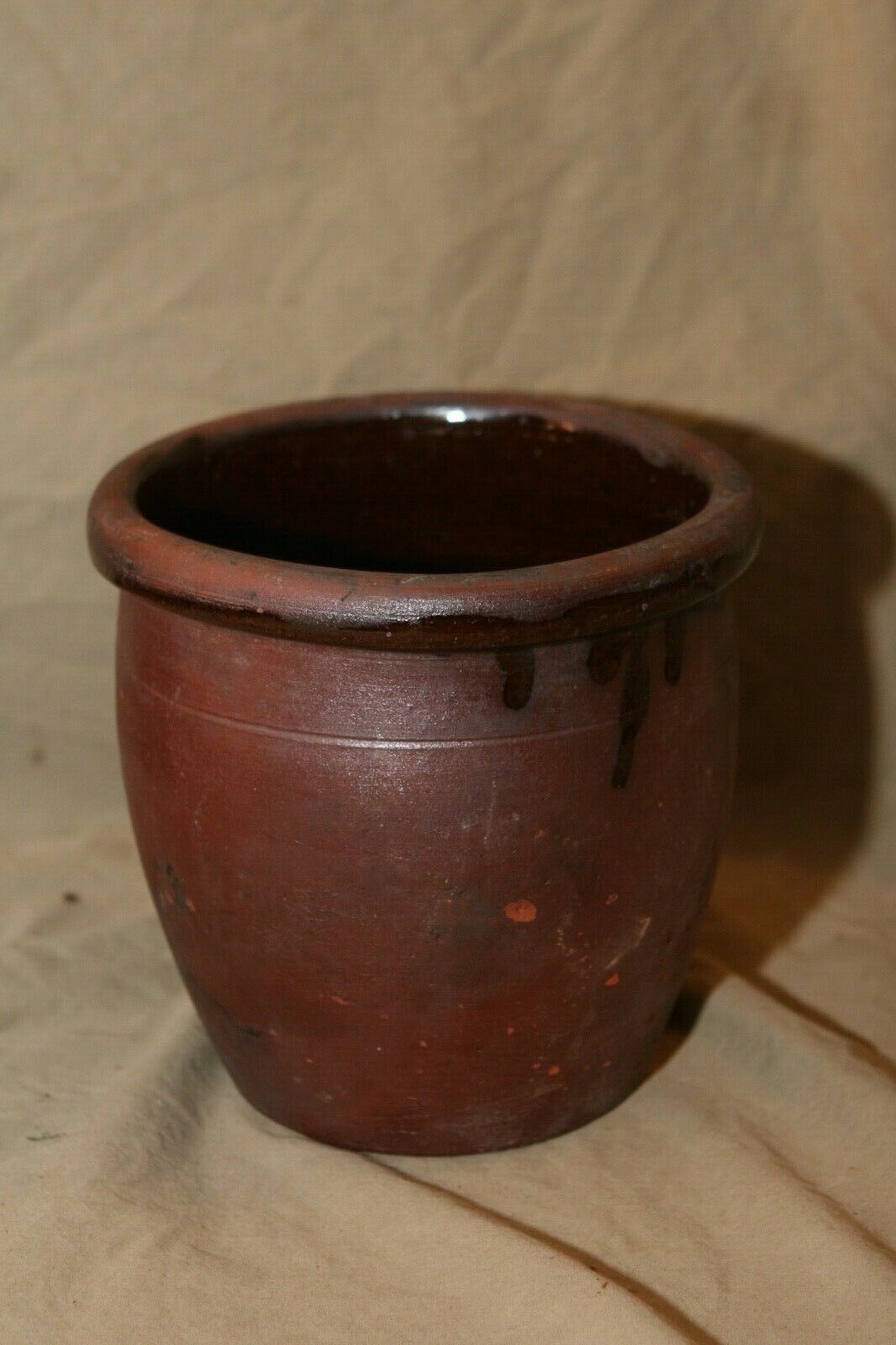 Title (ebay affiliate link): Antique 6.5" Redware Crock Large Apple Butter Albany Slip Glazed Interior Losses