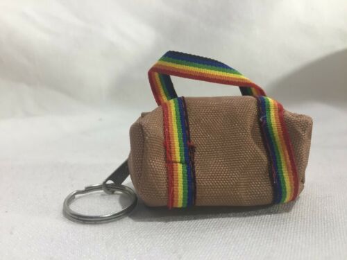 Title (ebay affiliate link): Vintage 70s Tan Duffle Bag Change Purse Key Chain Retro Rainbow Gift