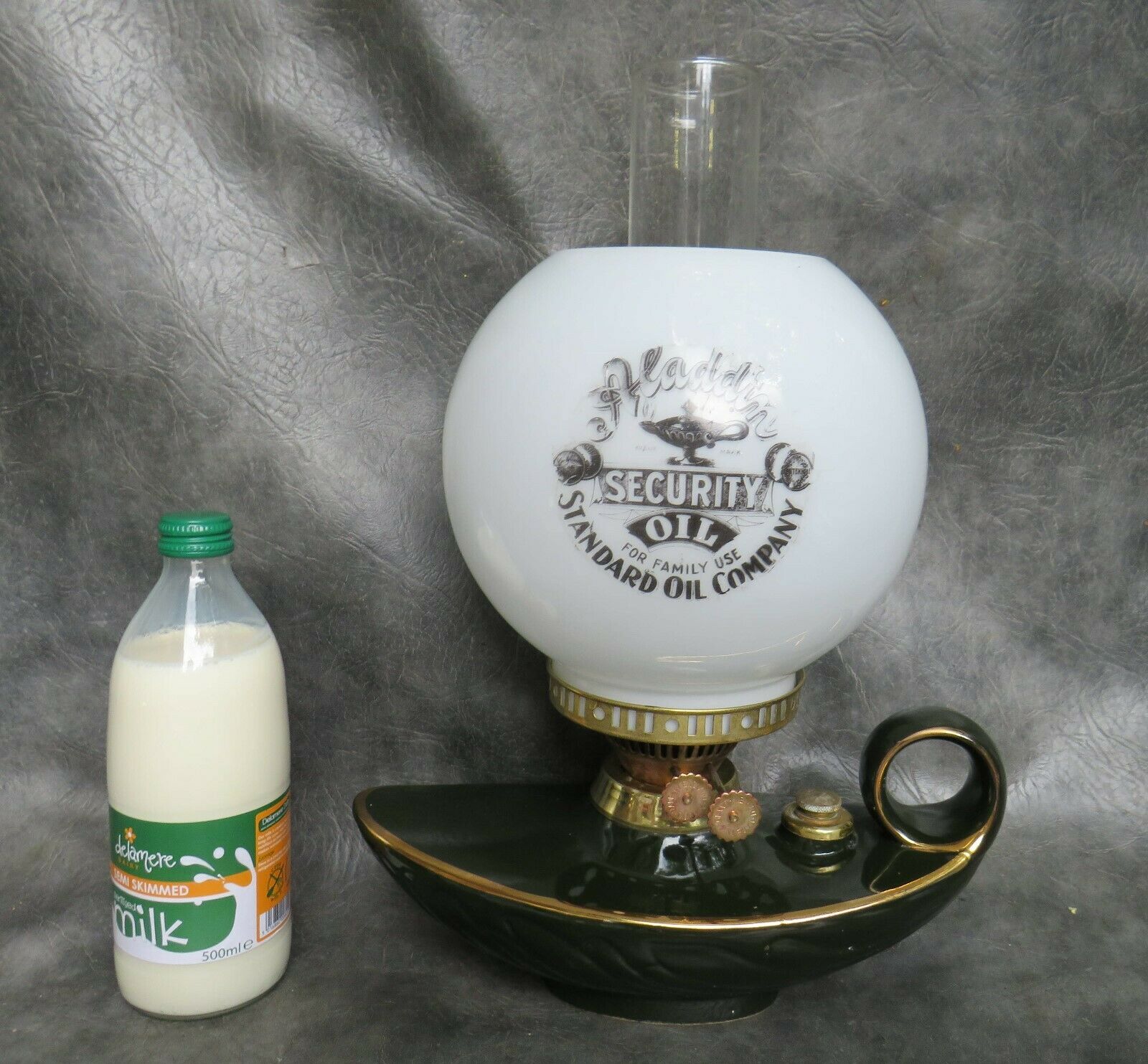 Title (ebay affiliate link): A NICE CERAMIC GENIE SHAPED OIL LAMP WITH ALADDINS OIL ADVERTISEMENT SHADE