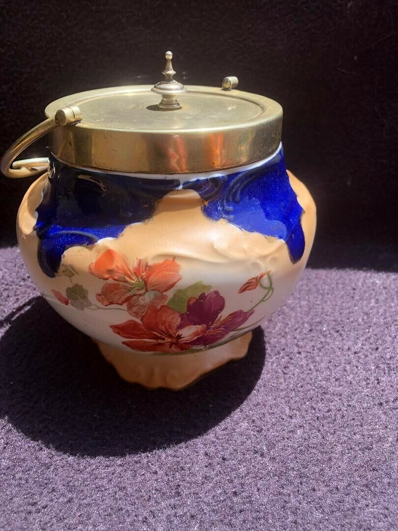 Antique hand painted victorian floral biscuit cookie jar, porcelaine, silver plt