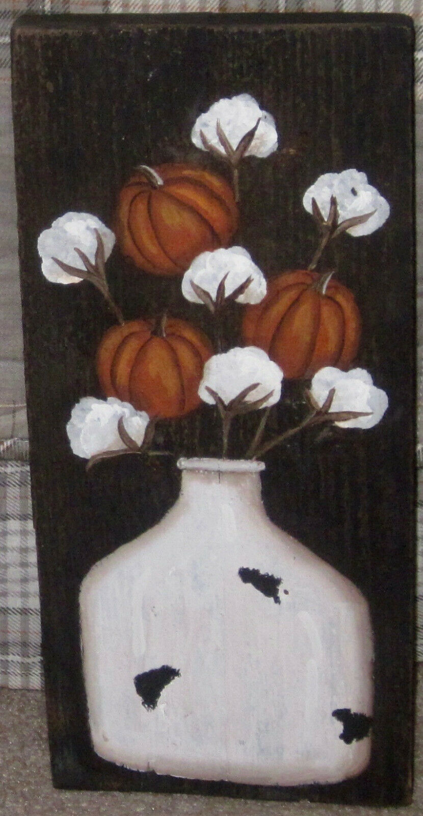 Title (ebay affiliate link): *~*PRIMITIVE*~* HP FOLK ART ENAMELWARE JUG * PUMPKINS * COTTON * RECLAIMED WOOD