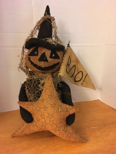 Title (ebay affiliate link): Primitive Folk ARt Black wool Pumpkin witch shelf sitter pantry doll star flag