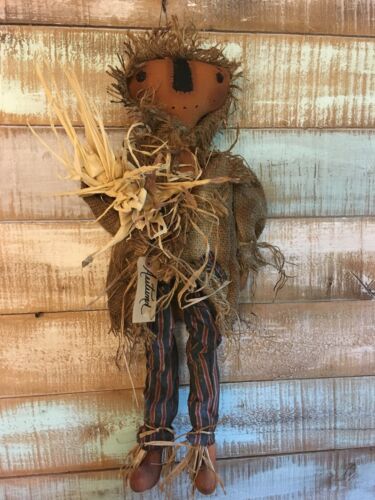 Title (ebay affiliate link): Primitive Grungy Pumpkin Scarecrow doll with Corn burlap coat Fall Halloween 29"
