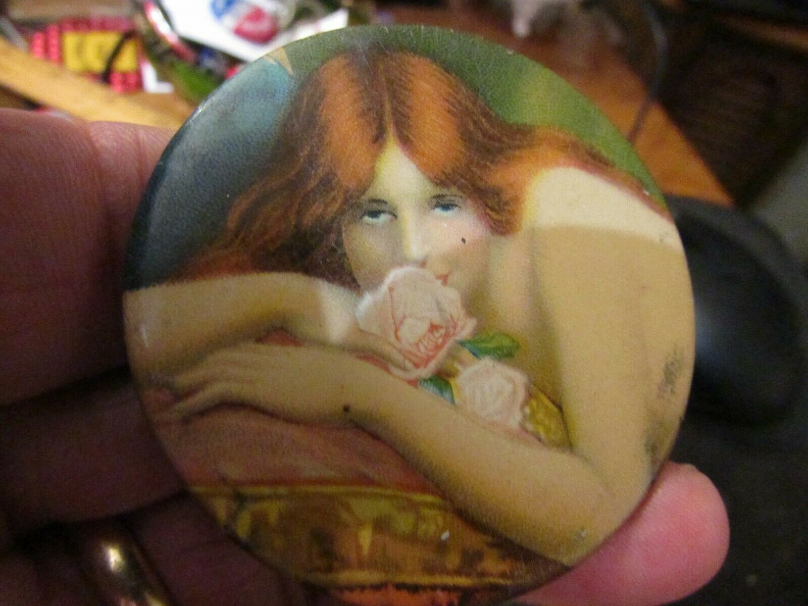 OLD ORIGINAL 2 3/16" celluloid round POCKET MIRROR of beautiful woman