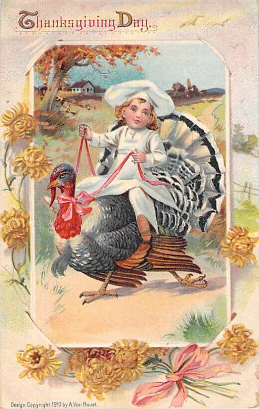 Title (ebay affiliate link): Thanksgiving German Postcard A. Von Beust 1910 Child Riding Turkey