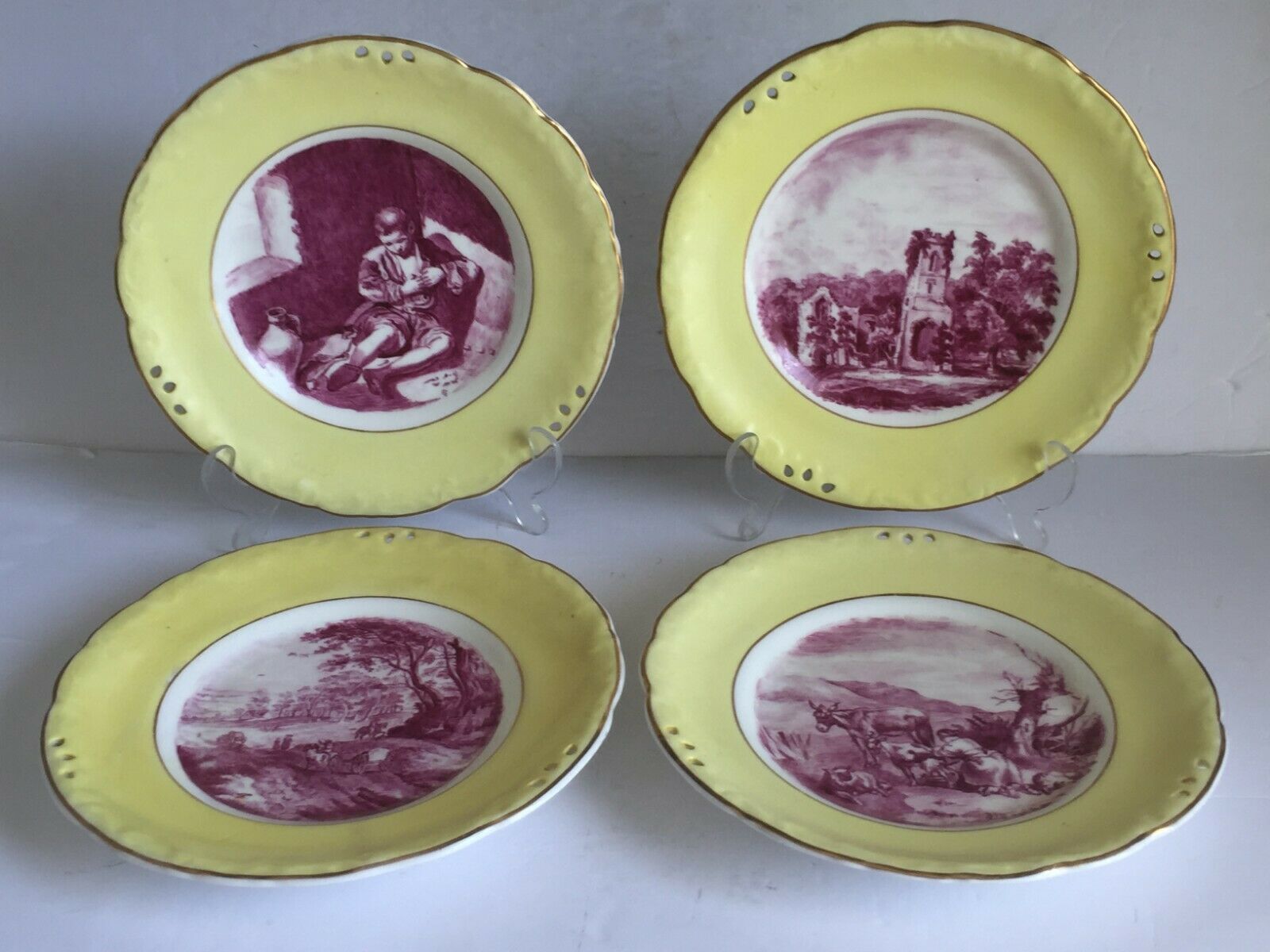 4pcs Antique PAINTED English Porcelain Plates PUCE Old Masters Yellow Border