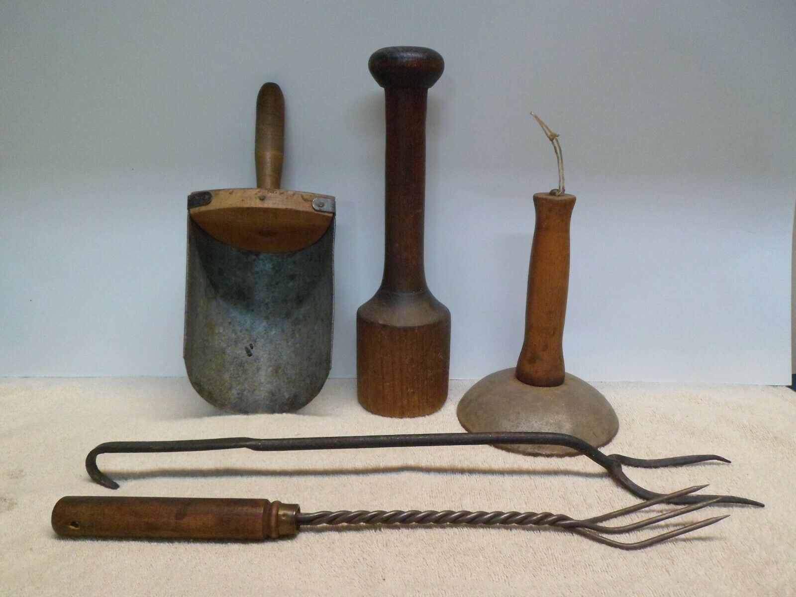Title (ebay affiliate link): Primitive Lot Flour Scoop, Oak Masher, Hog Scraper, Hand Forged Iron Fork - MORE