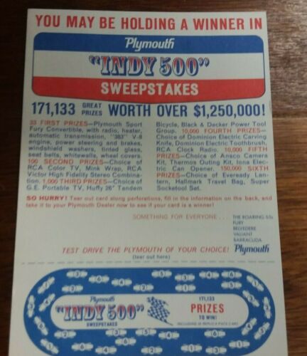 Title (ebay affiliate link): 1965 Plymouth Car Dealer "INDY 500" Sweepstakes Card CONVERTIBLE FURY PACE CAR