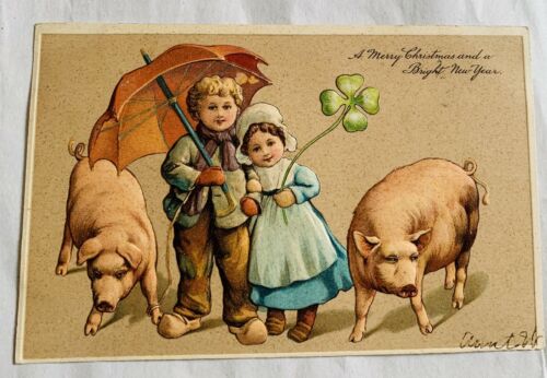 Title (ebay affiliate link): Vintage Embossed 1906 Christmas Postcard - Children Under Umbrella - Pigs