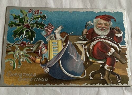 Vintage Christmas Postcard - Santa Claus On Telephone - Sack Of Toys