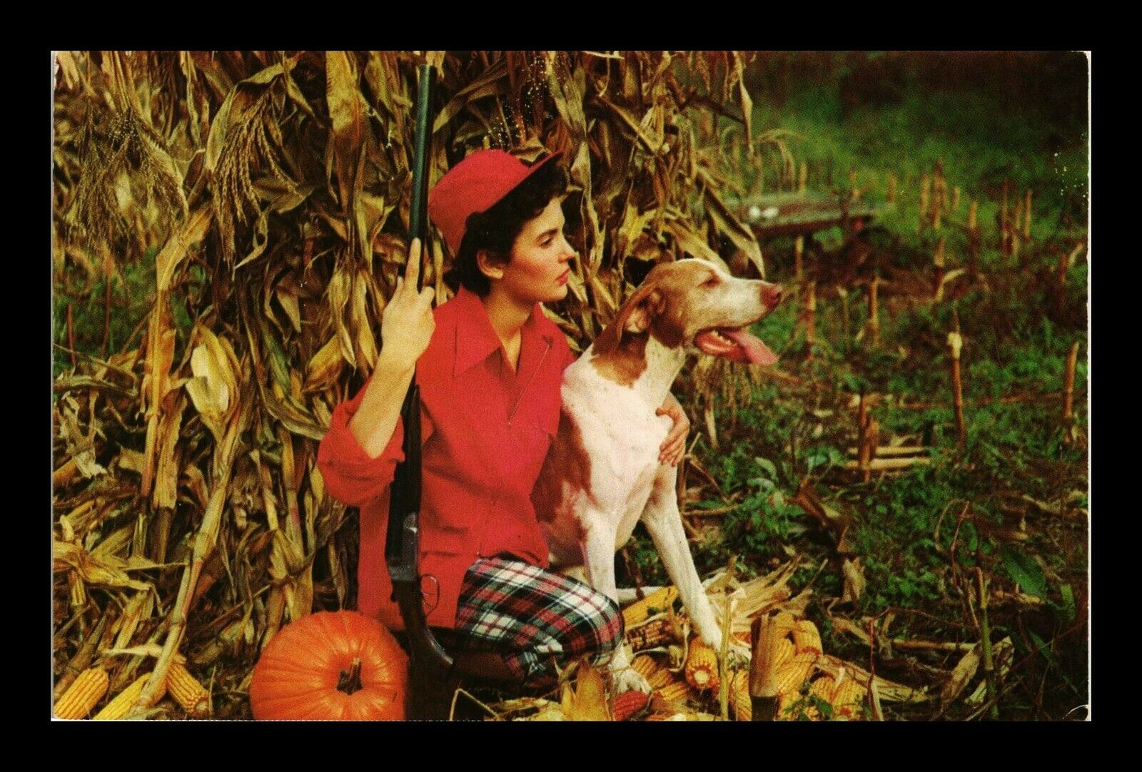 Title (ebay affiliate link): US POSTCARD AUTUMN CORN STALKS AND WOMAN WITH GUN AND HUNTING DOG
