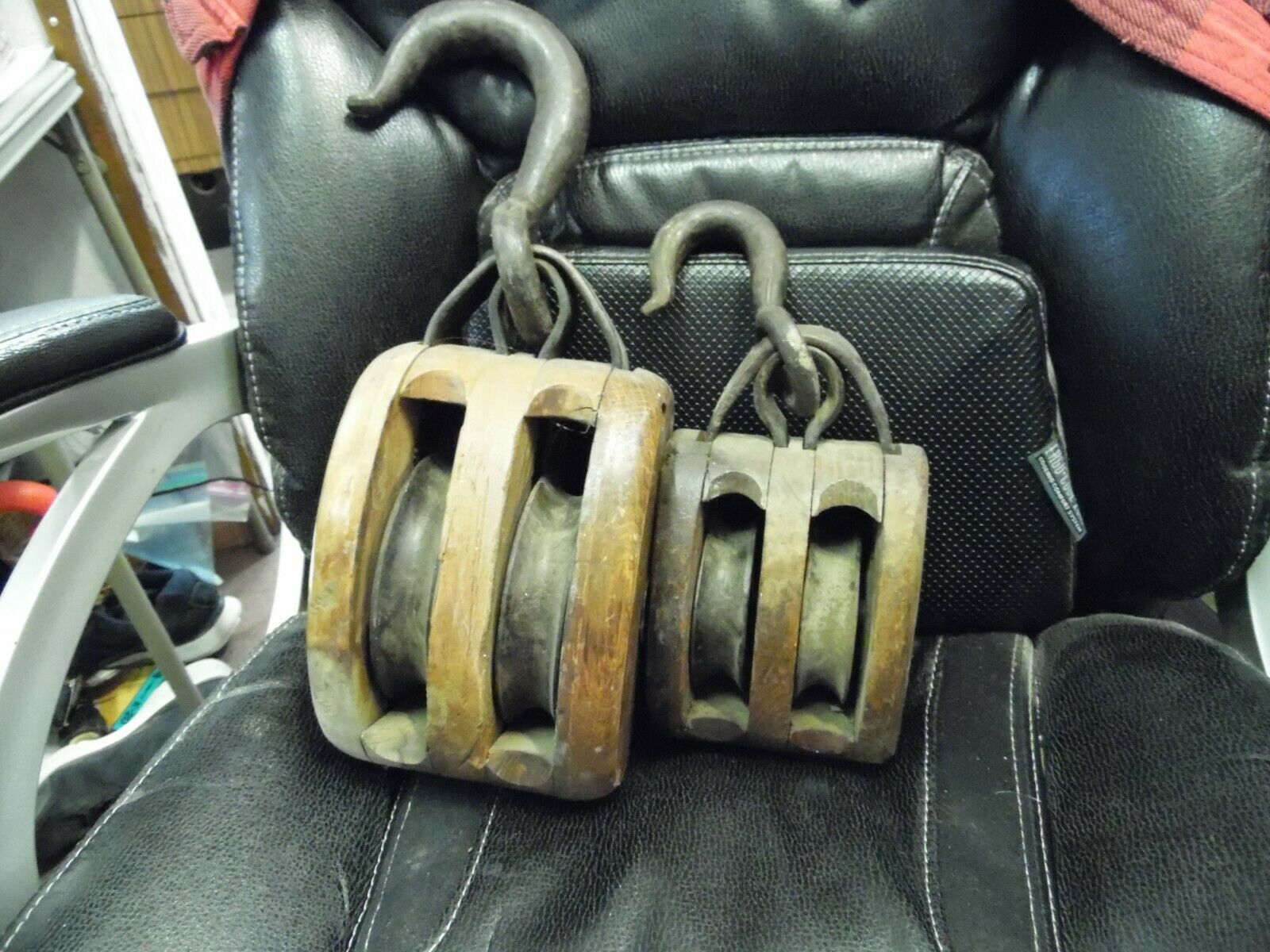 Title (ebay affiliate link): Pair vintage or antique block & tackle or pulleys wood and iron w/ hooks rustic