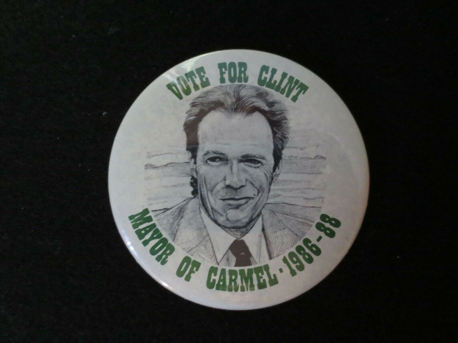 Title (ebay affiliate link): Celluloid Pinback for Clint Eastwood for Mayor of Carmel, California in 1986