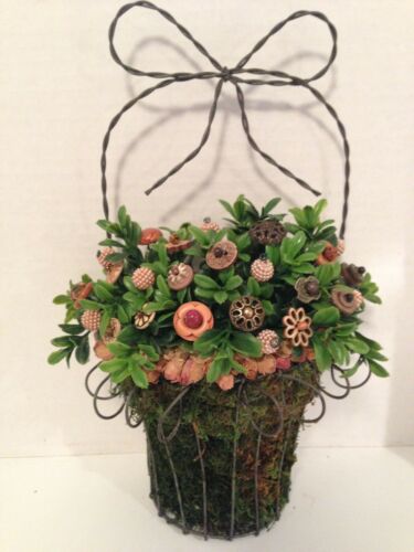 VTG Button Bokay/Wire Wall Pocket-Rustic Prim Country Cottage Chic Farmhouse