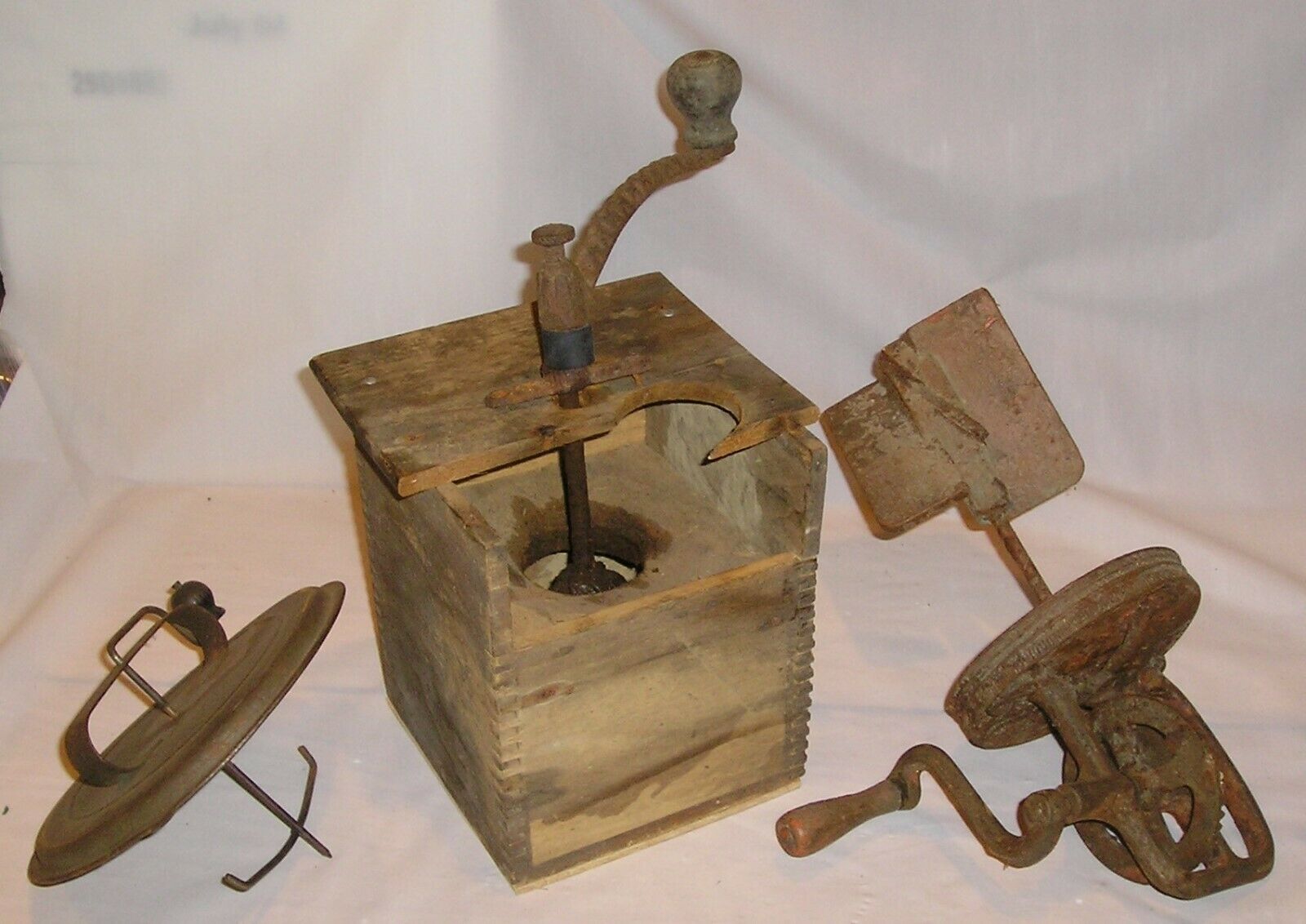 Title (ebay affiliate link): Lot of Primitives - Parts / Decor - Coffee Grinder, Churn Top, Popcorn Popper