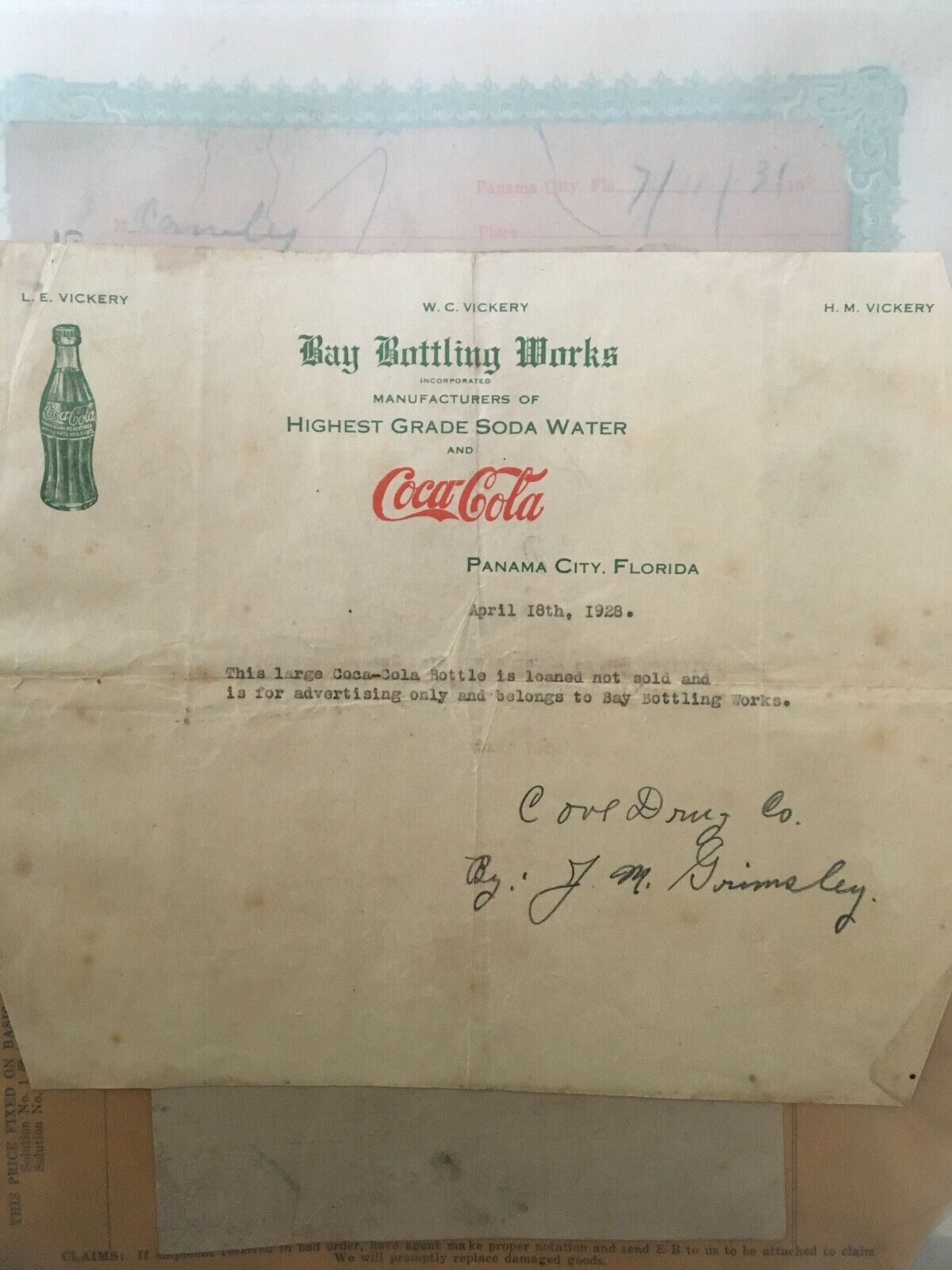 Vintage 1928 Coca Cola, Bay Bottling Works Letter To Cove Drug Company