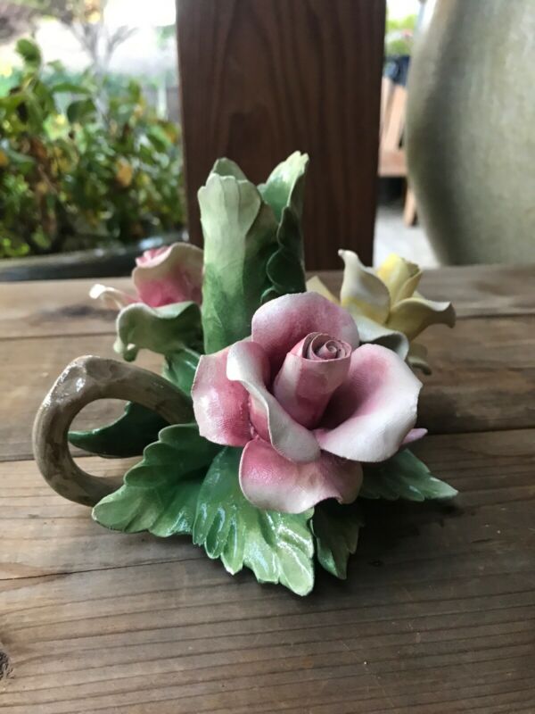 Title (ebay affiliate link): Vintage Capodimonte Style Porcelain Pink Rose Flower Handled Candle Holder