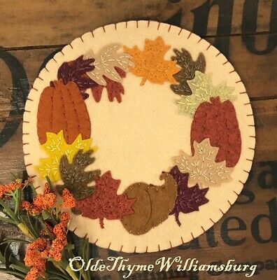 Title (ebay affiliate link): Primitive Stitchery HARVEST Pumpkins & Fall Leaves Penny Rug ~ Candle Mat