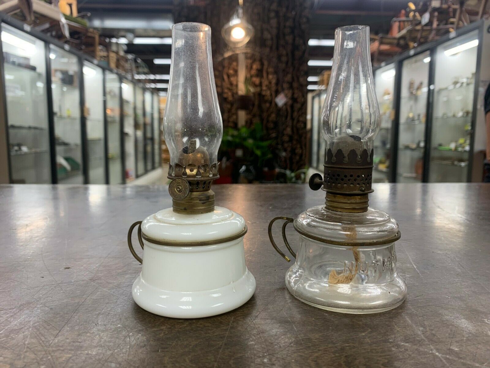 (2) Antique Milk Glass and Clear Glass - "Nutmeg" finger lamps / lanterns - RARE