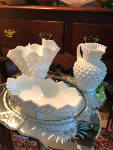 Title (ebay affiliate link): LOT OF FENTON MILK GLASS HOBNAIL HANDKERCHIEF 7 1/4" VASE SYRUP JUG AND DISH