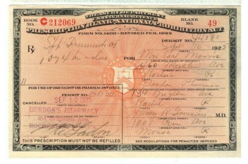 Title (ebay affiliate link): 1925 Treasury Department Prescription for Medicinal Alcohol During Prohibition