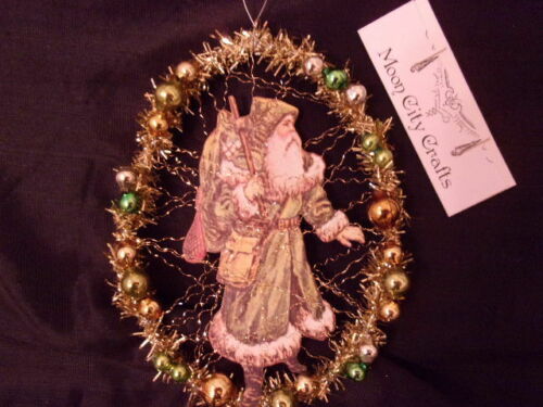Title (ebay affiliate link): Antique Look Christmas Ornament, SANTA In Green SCRAP, Glass, Tinsel, Handmade