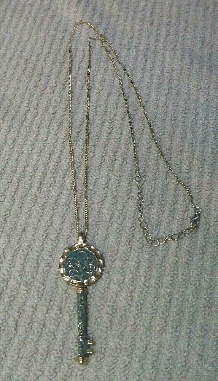 Vintage Goldtone & Teal Green Enamel Key pendant On Goldtone Chain